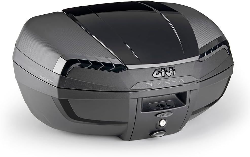 Monolock top case 46 lt. Black with black cover and smoked reflectors painted inside. Includes plate and universal kit The RIVIERA is the new top of the range of GIVI top cases with monolock attachment. The top case has been made using a system of moulds, called undercut, which allows to obtain a structure with greater rigidity along the contact line of the two shells... maintaining streamlined and rounded lines that benefit the aerodynamic appearance. The exterior looks clean and the overall structure of the product is much more durable than the normal standard with the same material. The Riviera offers a removable soft mat, attached to the bottom with a Velcro fastener, and can hold two full face helmets. The internal space allows you to accommodate the GIVI T502B soft bag (optional). The lock is compatible with the Security Lock SL101 key (optional). The top-case is prepared for the application of the E207 backrest and for electrical contacts useful for the operation of future optional accessories. The waterproof is excellent, the product has been tested both in the laboratory and on the road under storm and hail. Aesthetic details - Monolithic reflectors, finished with a special internal paint, which guarantees longer durability and hold the aesthetic quality over time. These elements, equipped with external fixing not visible, outline the versions of the E46 Riviera: E46N red reflectors, E46NT silver reflectors (unpublished colour), E46NB smoked reflectors painted internally. - The photo engraving on the outside, both on the lid and the bottom, with different textures. - The integrated lid rotation hinges appear to all intents and respects distinctive aesthetic elements.