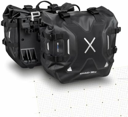 and Adventure TR30 side bags have been designed in Barcelona and have a capacity of 30 litres and up to 6 kg load each. The Adventure TR30 side bags stand out for their IPX6 waterproof rating and the "Double Locking System" (patent pending) locking system to lock the bag on the 4P and 3P system fixings and at the same time prevent access to the bag. Capacity: 30 litres each - 1 jet helmet. Double security system: Allows you to lock the bag on the 4P and 3P system fixings and prevent access to the bag at the same time. Compatible with 3P system (patented) and 4P system. Waterproof: IPX6 Made of polyester material with 0.15mm double-sided coating in black TPU + Hypalon TPU. UV resistance of 1,000 hours. Reinforced bases 6 buckles to adapt the bag to the size of the load and improve riding stability. All straps include end closures to prevent loose ends. Reflective elements Padded carrying handles. Size: X40 Y40 Z19 (cm) Maximum recommended load: 6kg each Motor lab e-bikers group EDC Casolla official dealers Shad